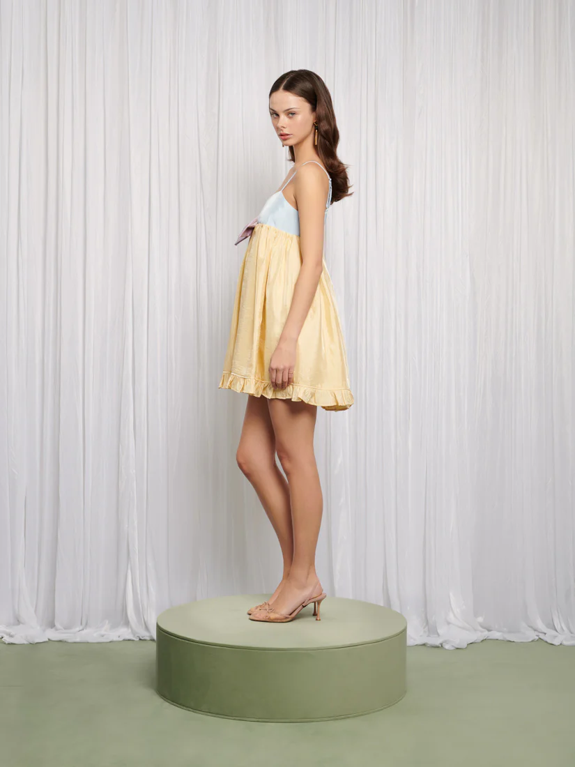 Pastel-perfect and made for sunshine twirls — this taffeta mini with a bold bow is pure joy in dress form. Light, bright, and ready to charm the socks off every spring soirée. Exclusively available at Sister Jane.