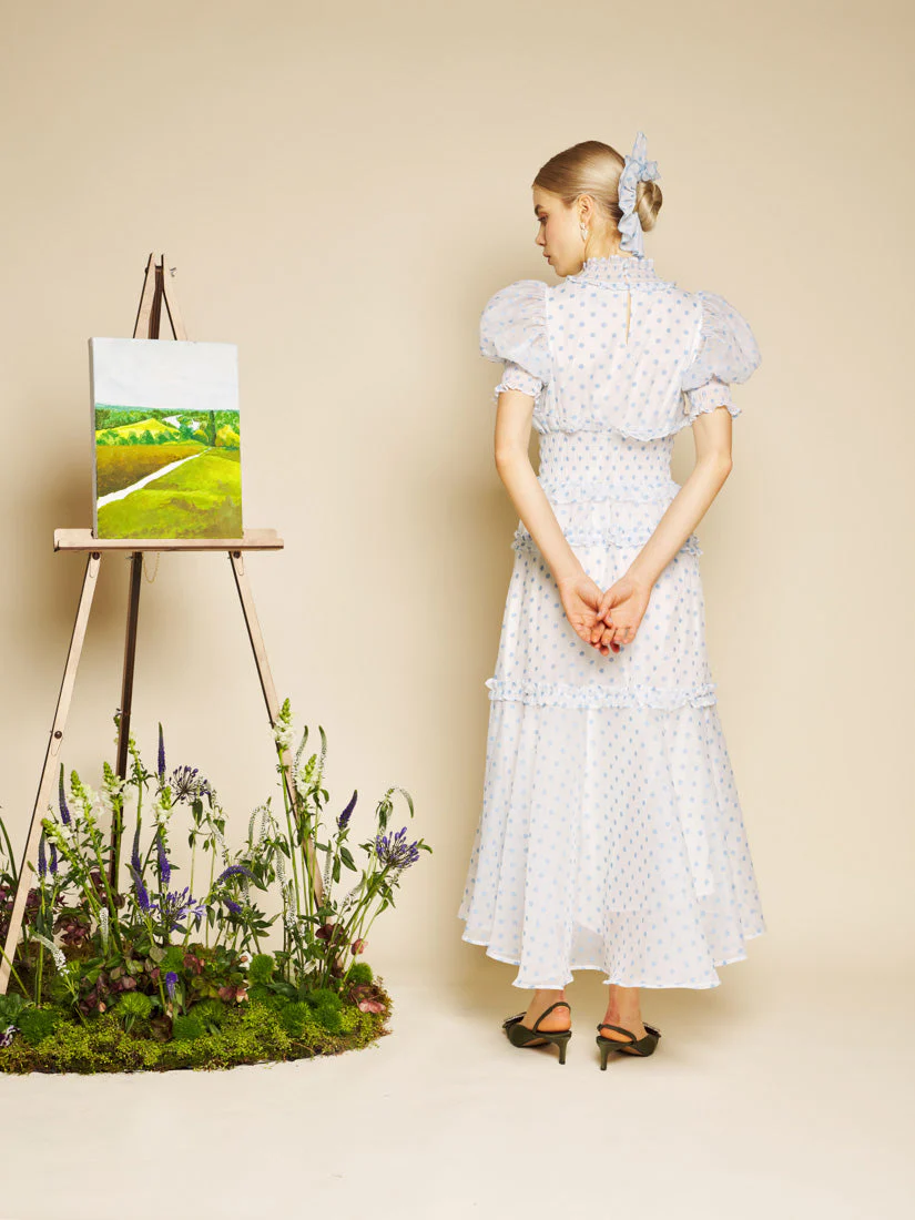 Polka dots scatter like flecks of paint across airy organza, cascading into ruffled movement. With its softly shirred silhouette, this maxi feels like a meadow caught mid-sway beneath an Impressionist sky.