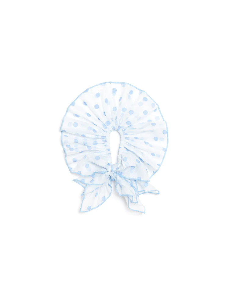 An oversized flourish of airy organza, this scrunchie gathers like a bouquet freshly tied from the garden. Polka dots dance across its surface, the trailing tie fluttering like ribbon caught in a gentle spring gust.